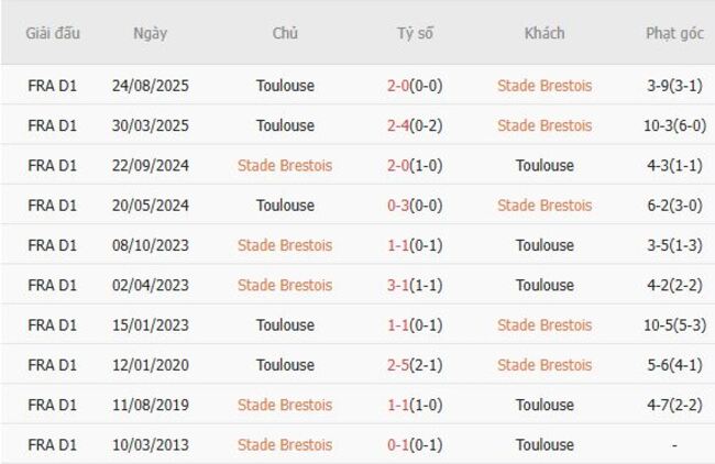 Thành tích đối đầu quá khứ giữa Brest vs Toulouse