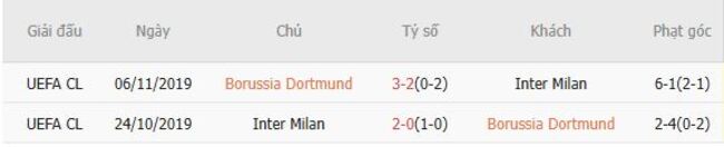 Thành tích đối đầu quá khứ giữa Dortmund vs Inter Milan