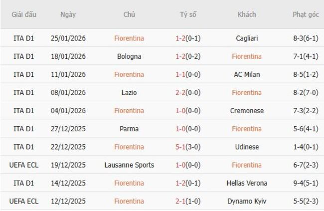 Sau khi thoát khỏi vị trí cuối bảng Serie A với chuỗi kết quả tích cực khởi đầu năm 2026, Fiorentina có cơ hội tốt để kéo dài xu hướng đó khi tiếp đón đối thủ cạnh tranh trụ hạng Cagliari vào thứ Bảy. Tuy nhiên, sau chuỗi trận tốt nhất trong một mùa giải tệ hại ngoài dự đoán, Viola đã để thua 2-1 tại sân vận động Stadio Franchi - nơi họ thường xuyên bị lội ngược dòng.