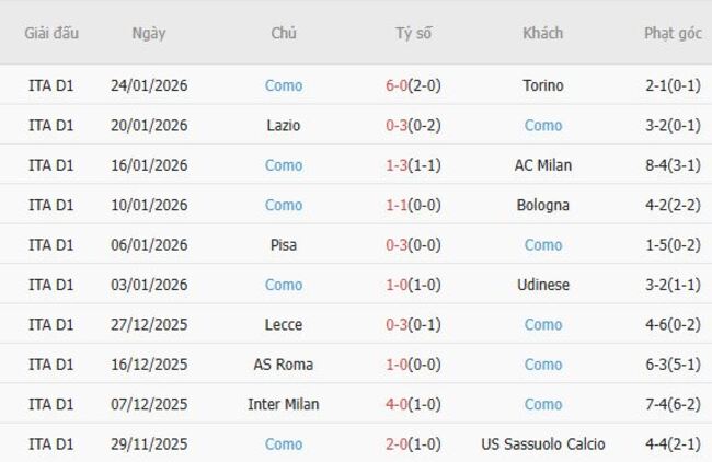 Sau chiến thắng ấn tượng 0-3 trên sân khách trước Lazio, đội bóng Lariani tiếp tục ghi tới 5 bàn vào lưới Torino cuối tuần qua, với cú đúp của Tasos Douvikas và Martin Baturina tiếp tục phong độ ấn tượng của mình. Sau chiến thắng đậm 5-1 trước Toro tại Turin, Como có khả năng ghi bàn ấn tượng đã chứng tỏ là đối thủ đáng gờm trong hành trình chinh phục tấm vé dự cúp châu Âu - điều mà câu lạc bộ khiêm tốn đến từ vùng Lombardy này chưa từng làm được trước đây.