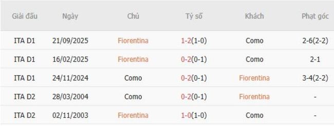 Thành tích đối đầu quá khứ giữa Fiorentina vs Como