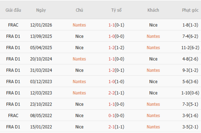 Thành tích đối đầu quá khứ giữa Nantes vs Nice